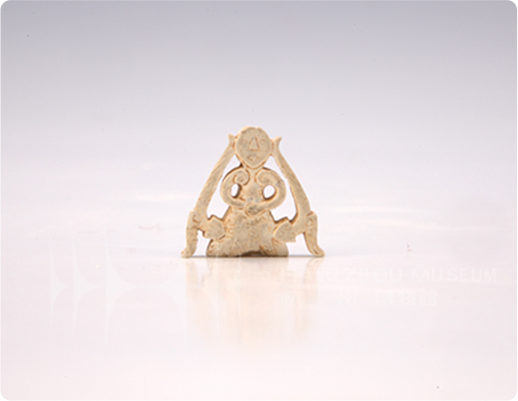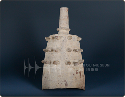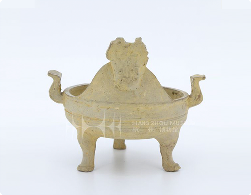 直口、平唇、直腹圆收,平底,底部安等距离三足,呈三足鼎立。口沿略外折,一端塑一兽头,双角断。眼鼻部位内凹,脸的下半部分向前突出。头中线有一条竖凸纹。自太阳穴起有两条凸线纹向鼻孔处延伸,然后向外走一个回纹,看似像鼻孔。与兽头对称塑一首尾,头尾之间的两端安对称立耳。施青釉,釉色青灰。直口、平唇、直腹圆收,平底,底部安等距离三足,呈三足鼎立。口沿略外折,一端塑一兽头,双角断。眼鼻部位内凹,脸的下半部分向前突出。头中线有一条竖凸纹。自太阳穴起有两条凸线纹向鼻孔处延伸,然后向外走一个回纹,看似像鼻孔。与兽头对称塑一首尾,头尾之间的两端安对称立耳。施青釉,釉色青灰。